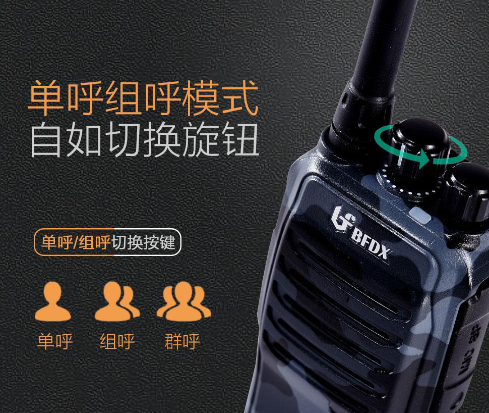 三、單呼組呼模式,自如切換旋鈕:獨立的單呼、組呼切換按鍵,輕松實現一鍵切換;BF-CM388還具有獨立的群組選擇旋鈕,齒輪式防滑人體工學設計,簡潔大方的刻度標尺,操作更加方便。切換模式、選擇群組和聯系人,更加快捷自如。