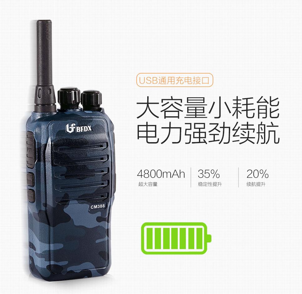 四、大容量小能耗,電力強勁續航:4800mAh超凡電池容量,電力更加強勁,續航時間更加持久。同時,BF-CM388能耗小,使得電力更加持久,能滿足日常3班工作需求。為戶內外環境,尤其應急環境下的使用,提供穩定可靠的通信保障。